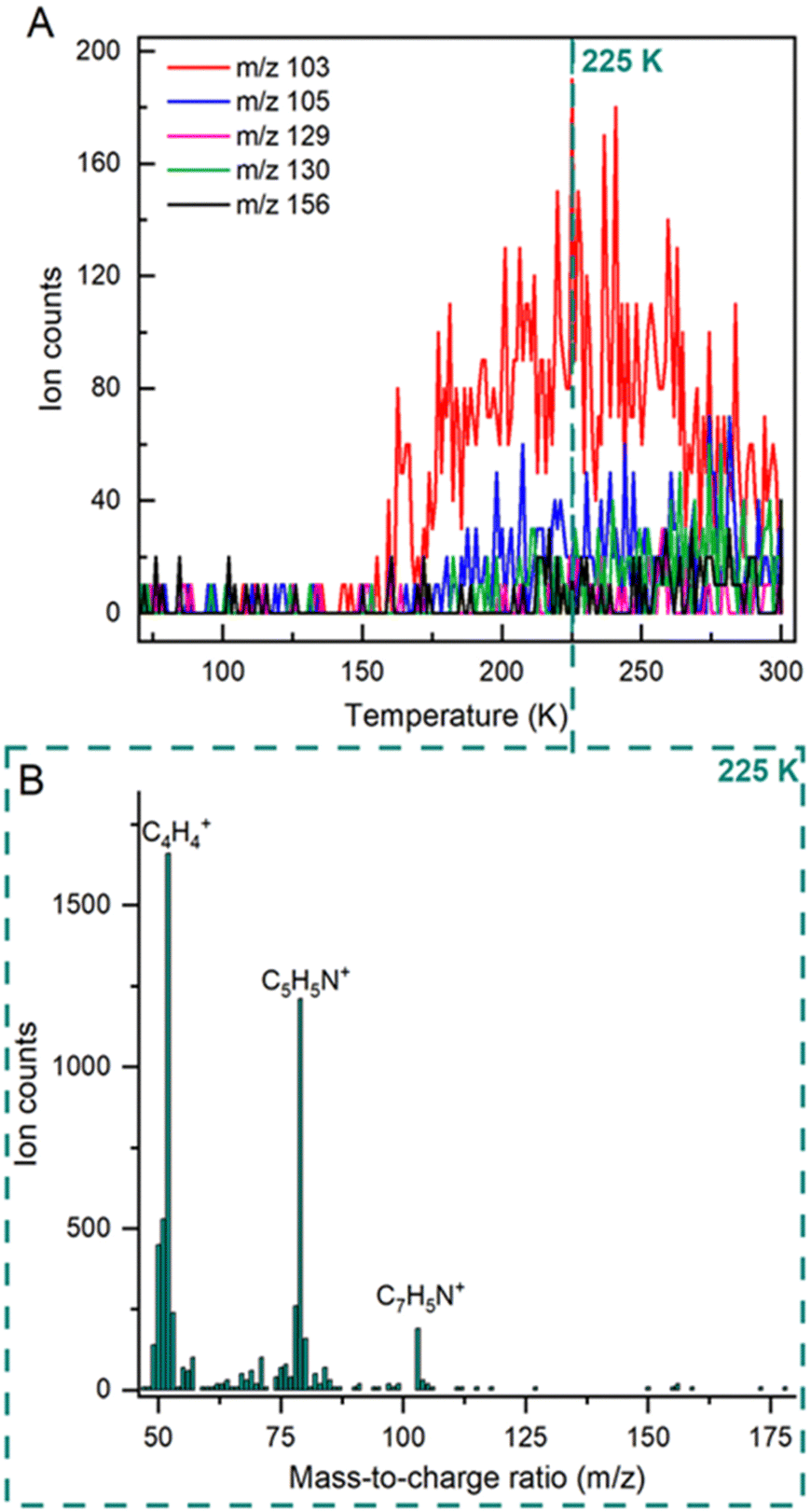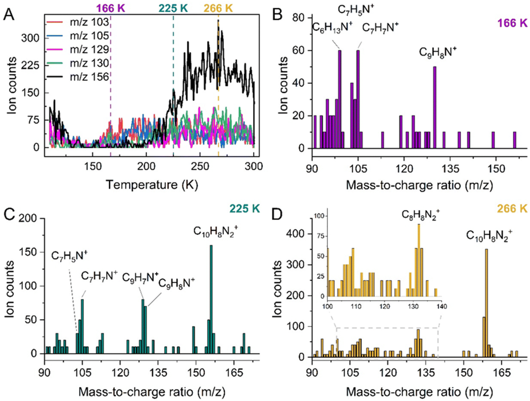 At 166 K, we detected the presence of species with m/z 103, 105 and 130, which correspond to photoproducts with empirical formulas C7H5N, C7H7N and C9H8N, respectively. Additionally, a signal with m/z 99 was detected and tentatively attributed to C6H13N+, although this species possesses a much higher H/C ratio than the other ions. At 225 K, the molecular ions m/z 103, 105, 129, 130 and 156 are all present, corresponding to C7H5N+, C7H7N+, C9H7N+, C9H8N+ and C10H8N2+. Lastly, the m/z 156 signal dominates the mass scan recorded at 266 K, corresponding to the C10H8N2+ molecular ion. Note the presence of m/z 132 was also detected above the noise threshold, which is attributed to the C8H8N2+ ion.