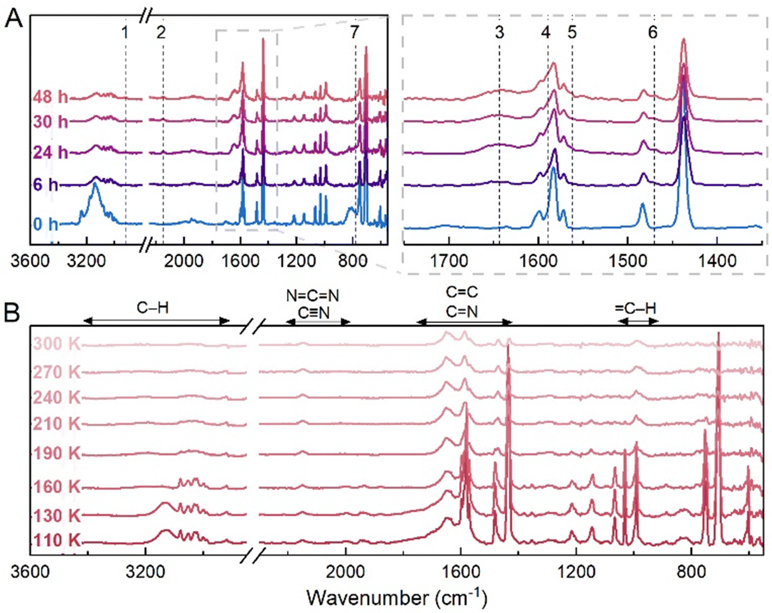 Fig. 5 Photochemical processing results after 48 hours VUV irradiation of the C5H5N:C2H2 co-crystal at 110 K. (A) IR spectra recorded after 0, 6, 24, 30 and 48 hours of irradiation. Dashed lines indicate the most prominent changes occurring in the spectra, with the appearance of bands at (1) 2921, (2) 2149, (3) 1643, (4) 1589, (5) 1561, (6) 1470 and (7) 776 cm−1. (B) IR spectra recorded during temperature ramp to 300 K. The main changes appear from 130 K onwards, where the co-crystal bands are observed to completely deplete. Above 160 K, bands corresponding to the vibrational modes of C5H5N also deplete, followed by a slow decrease in intensity for bands at 3079, 3052, 3028, 1437, 1148, 992, 775, 746 and 707 cm−1 to 300 K. Bands at 3003 (CH stretch), 2929 (CH stretch), 2143 (N C N or C N stretch), 1651, 1587, 1568 (sh), 1504, 1467, 1430 (conjugated and aromatic C C or C N stretches), 989 ( C–H deformation) cm−1 remain present at 300 K, indicating the formation of refractory residues. The vibrational mode regions for typical organic moieties are shown (B; top).59 | ||