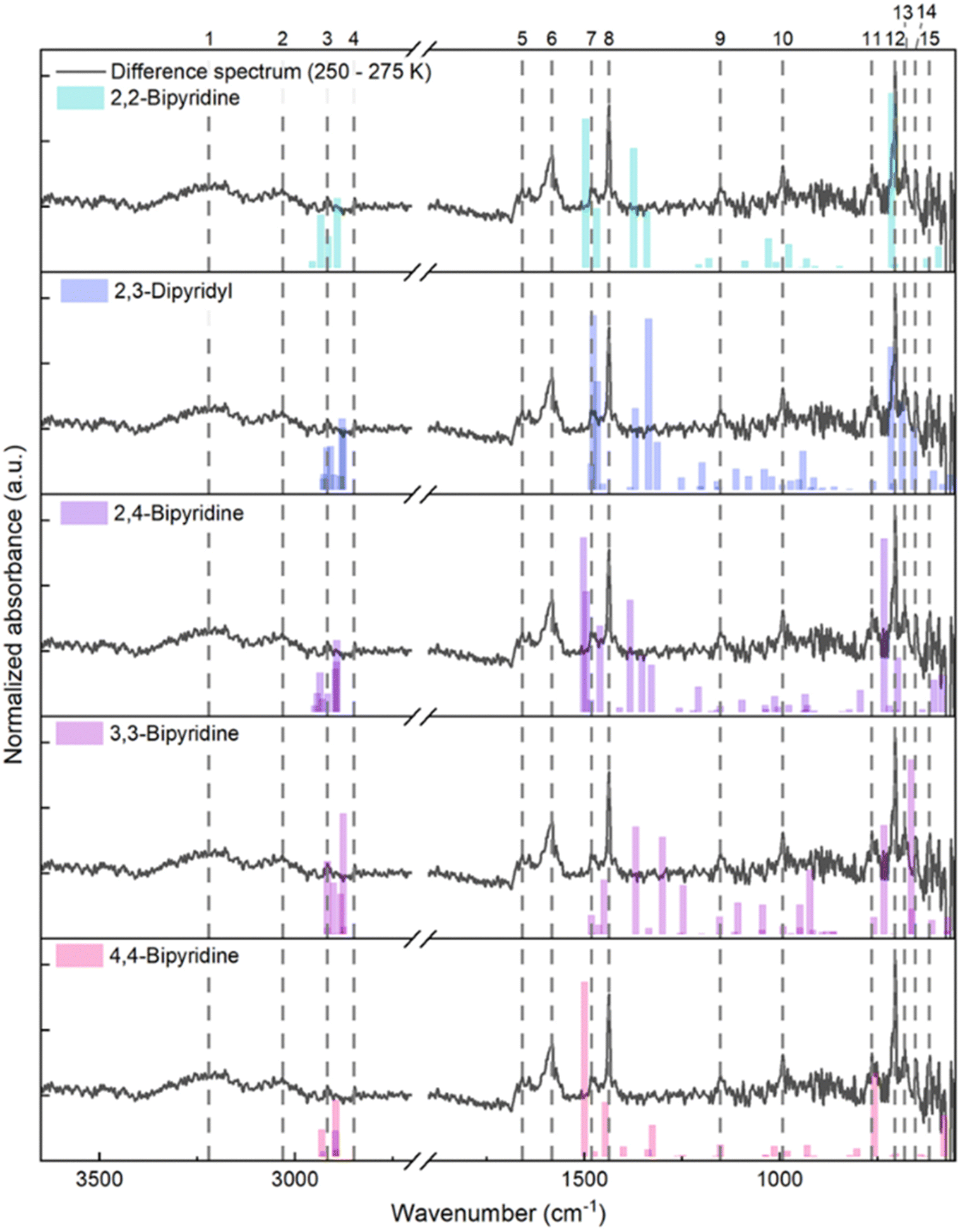 Compiling the IR difference spectrum between temperatures 250 and 275 K, two broad bands centred at 3220 and 3031 cm−1, as well as narrower bands at 2917, 2849, 1659, 1583, 1482, 1437, 1152, 992, 764, 705, 680, 653 and 617 cm−1, are associated with molecules desorbed over this temperature range (Fig. 7). Therefore, to confirm the identity of the m/z 156 photoproduct, we compare the IR bands of the sublimed species with single molecule harmonic frequencies for 2,2-bipyridine, 2,3-dipyridyl, 2,4-bipyridine, 3,3-bipyridine and 4,4-bipyridine (Fig. 7). After compiling the DFT calculated band positions for the bipyridines, the closest agreement between experiment and theory is for 2,3-dipyridyl, followed by 2,4-bipyridine and 3,3-bipyridine. However, the overlapping group modes for the structural isomers suggest that a distribution of bipyridine compounds is likely formed from the VUV exposure. Finally, the broad bands at 3031 and 1583 cm−1 could correspond to pyridine precursor trapped in a solid bipyridine matrix, while the few unassigned bands correspond to unknown species undergoing sublimation; the identity of these species was not further investigated.
