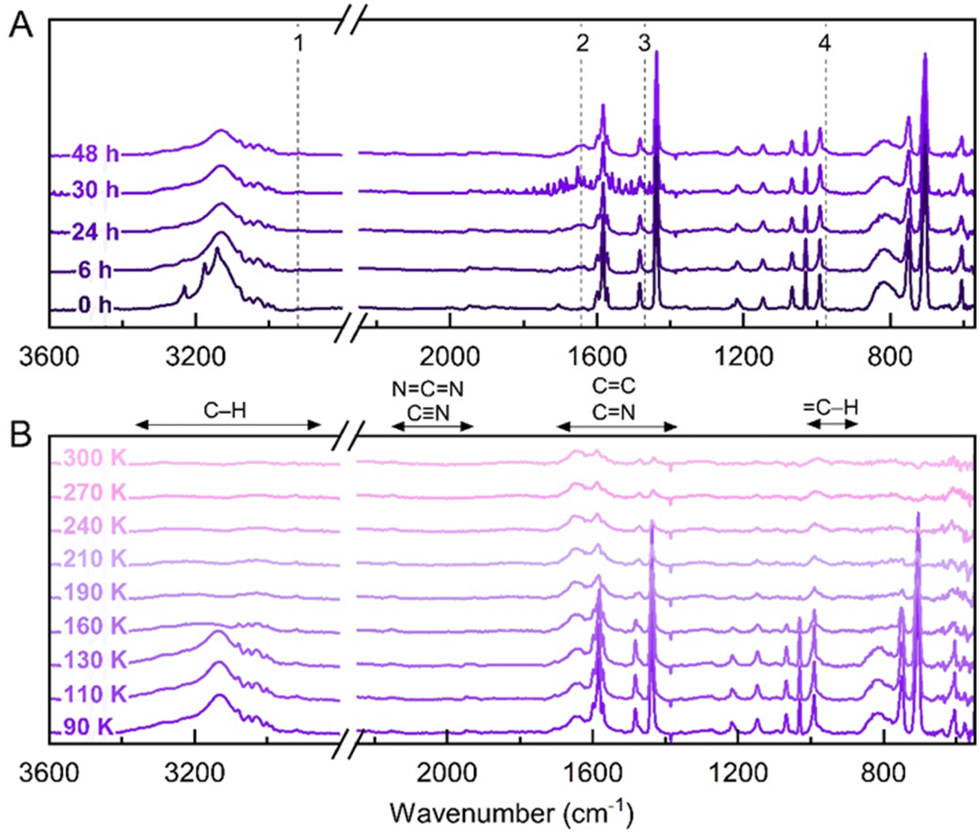 Fig. 8 Photochemical processing results after 48 hours VUV irradiation of the C5H5N:C2H2 co-crystal at 90 K. (A) IR spectra recorded after 0, 6, 24, 30 and 48 hours of irradiation. Dashed lines indicate the most prominent changes occurring in the spectra, with the appearance of bands at (1) 2921, (2) 1644, (3) 1470, (4) 977 cm−1. The spectrum taken after 30 hours shows atmospheric water interference caused by variations in the dry N2 supply to the IR detector. (B) IR spectra recorded during temperature ramp to 300 K. The main changes appear from 130 K onwards, where the co-crystal bands are observed to completely deplete. After 160 K, bands corresponding to the vibrational modes within C5H5N also deplete, followed by a slight decrease in intensity for bands at 3201, 1295, 1214, 749, 706 and 610 cm−1 to 300 K. Bands at 3281, 3032, 2917 (CH stretch); 2155 (N C N or C N) 1650, 1583, 1471, 1437 (C C or C N stretch); 1149, 991 (C–H deformation) cm−1 remain present at 300 K, indicating refractory residues are formed. The vibrational mode regions for typical organic moieties are shown (B; top).59 | ||