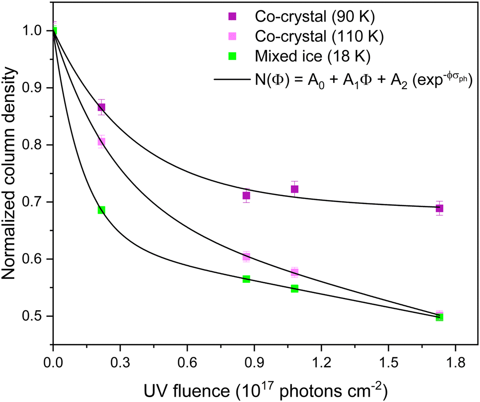 From the C5H5N depletion data, the photolysis cross-sections are measured to be 7.60 (± 0.03), 3.59 (± 0.14), and 2.84 (± 1.27) × 10−16 cm2 for the C5H5N and C2H2 mixed ice irradiated at 18 K, the C5H5N:C2H2 co-crystal irradiated at 110 K, and at 90 K, respectively. The overall behaviour of the photolysis plots suggests a more rapid C5H5N depletion for the amorphous mixed ice and co-crystal at 110 K and slower depletion of pyridine for the 90 K system.