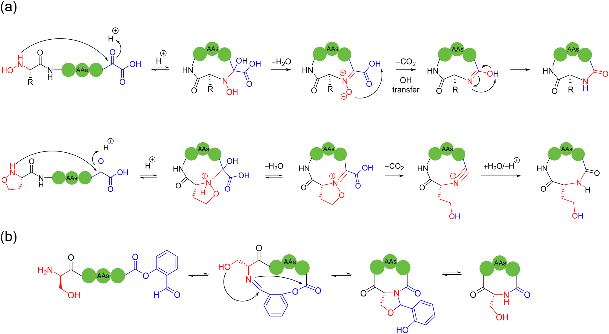 The 1,2-aminothiol of the N-terminal cysteine could easily condense with aldehydes to form thiazolidines, in the protocol first reported by Tam and coworkers to prepare cyclic peptides in 1996.75 In their method, the starting C-terminal ethanolaldehyde ester could first be obtained by the oxidation of glycerol ester under solid-phase peptide synthesis (SPPS). By adjusting the pH value to 5.5 in aqueous solution, an intramolecular condensation between the N-terminal cysteine and C-terminal ethanolaldehyde ester could be triggered to form a thiazolidine intermediate. Subsequently, raising the pH value to 5.9 could enable another intramolecular rearrangement to achieve O-to-N acyl transfer, thus completing the cyclization (Scheme 13b). Only through tuning the pH environment, this reaction could be very simply, conveniently and widely applicable to unprotected peptide main chains without special sequence requirement, except for the two terminal groups. However, the reaction rate of this method is too slow and the inevitable introduction of a new stereocenter on the C-5 carbon of the thiazolidine ring leads to a pair of undesired diastereomers.