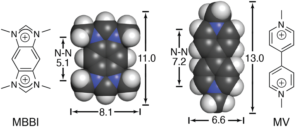 Methyl viologen is limited as an optical sensor due to its lack of intrinsic fluorescence. Several alternative auxiliary guests for Q8 have been developed with intrinsic fluorescence (Fig. 21). Kaifer and coworkers replaced MV as a first guest for Q8 with 2,7-dimethyldiazaphenanthrenium (DPT2+) and 2,7-dimethyldiazapyrenium (DAP2+), which have limited rotational freedom, compared to MV, and are intrinsically fluorescent.99 The resulting Q8·guest complexes bound to indole, tryptophan, and serotonin, which quenched the fluorescence of the first guest. We followed this work with a report on the use of tetramethylbenzobis(imidazolium) (MBBI) as an intrinsically fluorescent sensing component for peptides, as described in more detail in Section 2.5.43
