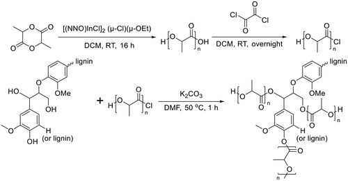 Lignin-graft-PLA synthesized by a graft-onto method was reported by Chile et al. in 2018.106 PLA was separately synthesized by ring opening polymerization in the presence of [(NNO)InCl]2 (μ-Cl)(μ-OEt), and the end group of PLA was modified as the chloride derivative. The modified PLA-Cl was grafted onto lignin with K2CO3 in DMF. When comparing the ratio of lignin to PLA in the produced polymer, the graft-onto method showed a higher lignin portion than the graft-from method for lignin-graft-PLA (Scheme 8).