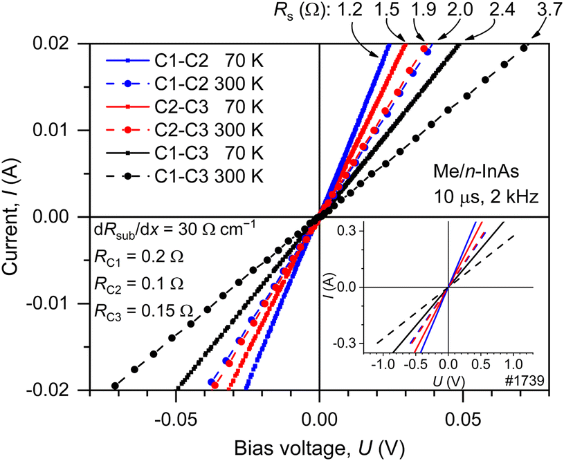 The abovementioned effects may be responsible for the sample cooling in our experiments as these particular effects are usually accompanied by other sample properties, namely specific features of I–V characteristics. As seen in Fig. 3, there are no grounds to consider any kind of barriers at the Me/n-InAs interface as the I–V characteristics are linear.