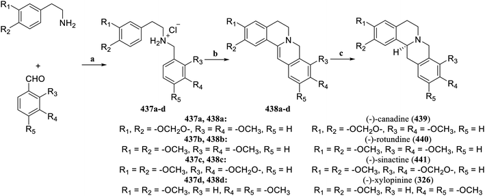 In 2021, Chen's group completed the asymmetric total synthesis of tetrahydro-protoberberine alkaloids (Scheme 25).157 First, the efficient and sustainable synthesis of the secondary amine hydrochlorides 437a–d was realized by using disubstituted phenethylamine 331, 358 and disubstituted benzaldehyde as raw materials through a continuous flow system. The key Pictet–Spengler reaction/Friedel–Crafts hydroxyalkylation/dehydration cascade cyclization reaction conditions were subsequently optimized to further convert 437a–d to dihydroprotoberberines 438a–d. By screening the chiral ligands, the Ir-catalyzed enantioselective hydrogenation was successfully realized, the chiral center of C-14 was constructed, the efficient asymmetric total synthesis of (−)-canadine (439), (−)-rotundine (440), (−)-sinactine (441), and (−)-xylopinine (326) were completed.