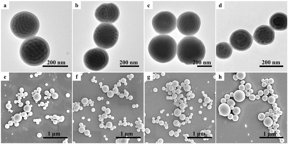 | Fig. 3 TEM and corresponding SEM images of V3.0kS24.2kV3.0k triblock copolymer particles obtained via 3D-SCSA with various CTAB concentrations of (a and e) 0.1, (b and f) 0.5, (c and g) 1.0, and (d and h) 5.0 mg mL−1. The TEM samples were stained with iodine vapor. | |