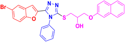3.1.6.5. Synthesis of 1-((5-(5-bromobenzofuran-2-yl)-4-phenyl-4H-1,2,4-triazol-3-yl)thio)-3-(naphthalen-2-yloxy)propan-2-ol 11e. In accordance with the general procedure Section 3.1.6, the reaction of benzofuran-based triazole 9e (0.1 g, 0.26 mmol) upon treatment with 2-((naphthalen-2-yloxy)methyl)oxirane 10b (0.065 g, 0.32 mmol) and K2CO3 (0.037 g, 0.26 mmol) in water (2 mL) yielded 11e in 90% yield.