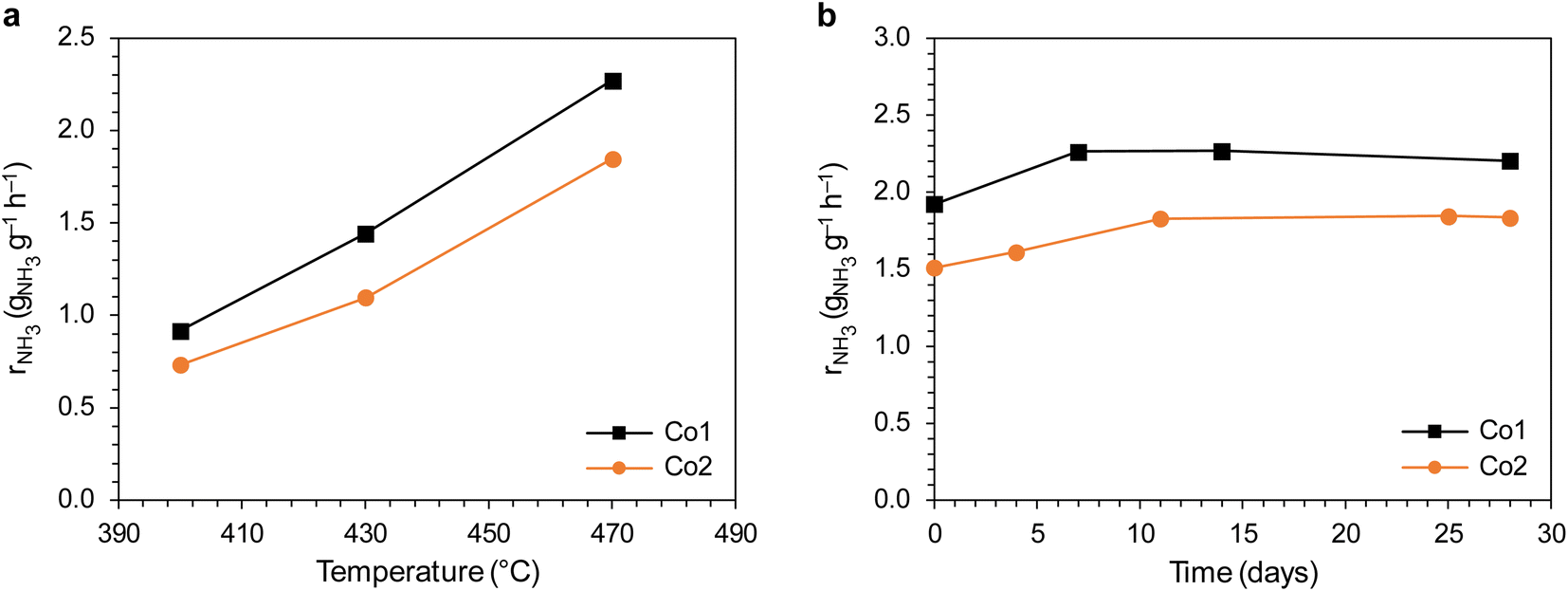 Next, the ammonia synthesis activity of the Co1 and Co2 catalysts was examined. Fig. 14a shows the ammonia synthesis rate of the catalysts at 400–470 °C. The results disclose that the ammonia synthesis rates of Co1 were higher than those of Co2. For example, at 400 °C, the NH3 synthesis rate of Co1 (0.92 gNH3 g−1 h−1) was about 1.3 times higher than that of Co2 (0.73 gNH3 g−1 h−1). In addition, the ammonia synthesis rate over Co1 and Co2 remained stable for 28 days, demonstrating the long-term stability of the catalysts. Fig. S6† shows that the apparent activation energies (Ea) derived from the slopes of the Arrhenius plot are 52.0 kJ mol−1 for Co1 and 54.8 kJ mol−1 for Co2, indicating that the presence of K in Co1 did not affect the activation energy to any significant degree.