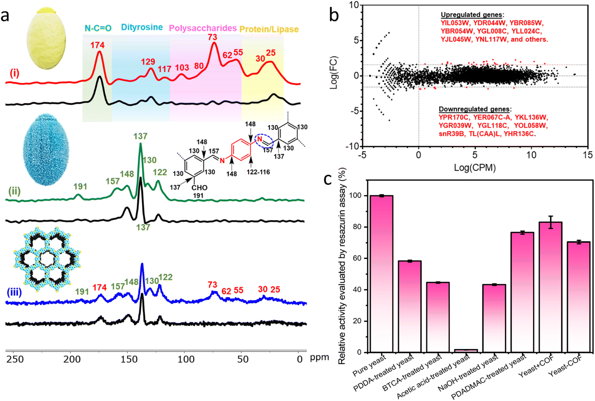 | Fig. 2 Characterization of yeast-COF. (a) Solid-state 1D 13C NMR spectra of (i) native yeast, (ii) COF, and (iii) yeast-COF. The red, green, and blue lines represent all the carbons, while the black lines represent only the quaternary carbons in each case. The COF structure is shown, blue: C, yellow: N. (b) A graph with the counts and log fold changes that may have differential expression. The red points indicate the potentially differentially regulated genes. The cut offs used were a three-fold change (log 2 fold change + or – 1.58) and a minimum read count (log CPM) of 0. (c) Cell activity evaluated by the resazurin assay upon treatment with different precursors. | |