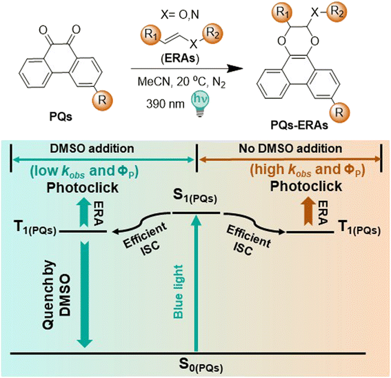 Reported indications of DMSO influencing the triplet states of p-quinones made us realize that potentially such an effect could also occur with the o-quinone PQ studied here.27,28 To investigate the generality of this DMSO-effect on the PQ-ERA photoclick reaction, we examined a range of PQ derivatives with varying substituents (depicted in Fig. 2A, ranging from electron-withdrawing groups to electron-donating groups). The kobs(390) for these photocycloaddition reactions was quantified (for detailed information, see ESI, Section 2.1, Fig. S5†) under both DMSO and DMSO-free conditions. Notably, as illustrated in Fig. 2B, the kobs(390) values for all PQ derivatives were significantly higher without DMSO co-solvent, aligning with the trend observed for the unsubstituted PQ.