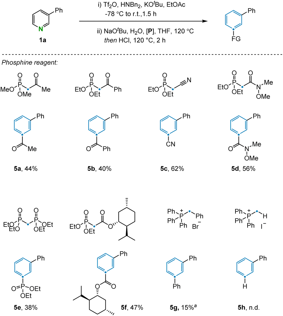 The transformation was further examined by exploring alternative olefination partners that could be used to install diverse functionality on the benzene products (Fig. 3). A range of synthetically useful functionalized carbon atoms could undergo transmutation with the pyridine nitrogen to deliver decorated benzene compounds that contain both aliphatic (5a) and aryl (5b) ketones as well as nitrile (5c), amide (5d), phosphate ester (5e), and ester (5f) functional groups. However, when the reagent benzyltriphenylphosphonium was examined under the reaction condition, only 15% yield was obtained due to incomplete conversion in the electrocyclization step (5g). The same issue was also observed during attempts to install the corresponding C–H bond in the product, with no indication of benzene formation in this case. However, transmutation of N-to-CH can still be conceptually be achieved via a sequence of ester hydrolysis and subsequent decarboxylation.24 Alternative phosphonium reagents bearing electron-donating groups were evaluated but failed to produce the desired products, presumably because electron-rich 6π-systems are not conducive to cyclization (see ESI Section 4.2†).