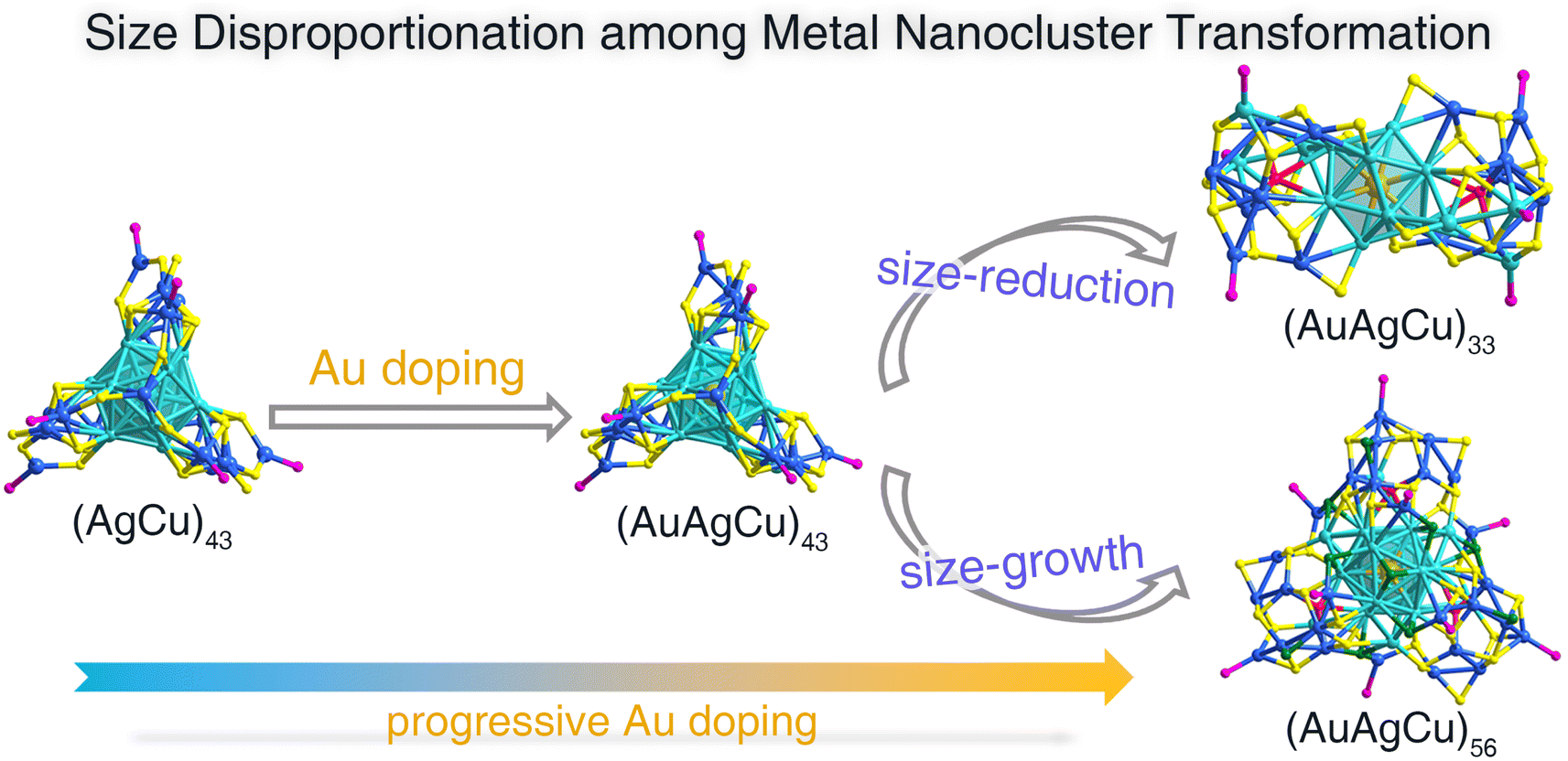 The (AgCu)43 nanocluster underwent size disproportionation induced by a heavy Au-doping process, leading to the formation of size-reduced (AuAgCu)33 and size-increased (AuAgCu)56 nanoclusters. The (AuAgCu)56 cluster molecules were crystallized in a P21/c space group, whereas the (AuAgCu)33 molecules were crystallized in the P