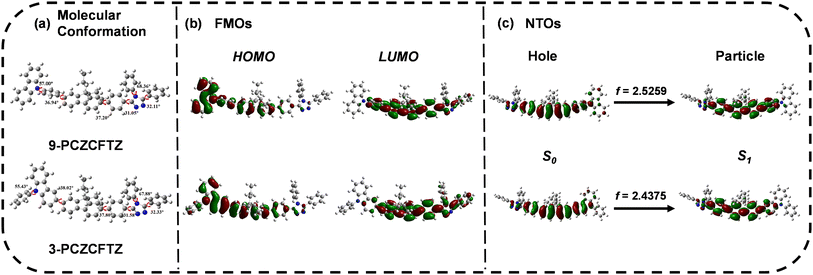 | | Fig. 1 (a) Geometries and structural formulas, (b) frontier orbital distributions, and (c) the S0 → S1 natural transition orbits (NTOs) of the two investigated molecules. | |