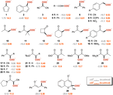 Calculations were performed with Gaussian16 software.41 Most carbanions included in this study possess few rotatable bonds. In the cases of anions with possible multiple conformations that may impact the target C-site reactivity (i.e. anions R23, R24, R25, and R272−), an initial conformational search was performed with a semiempirical pm3 method42–44 including a solvation model for acetonitrile to identify the most stable conformers that were then optimized with DFT methods (see ESI, Fig. S1–S4). In the manuscript and in the correlations presented, we report ΔG and ΔG0 data for the most stable conformer of these anions. We have corroborated this assumption by performing calculations and analysing the ΔG and ΔG0 data also for the second most stable conformer of R23, R24 and R25. From the results reported in Table S1 in the ESI, the variations of the calculated activation and standard free energy of carboxylation resulting from changes in the nature of the initial conformer are in a range of 0.16–0.65 and 0.73–2.14 kcal mol−1, respectively, minimally impacting the correlations presented in this work.