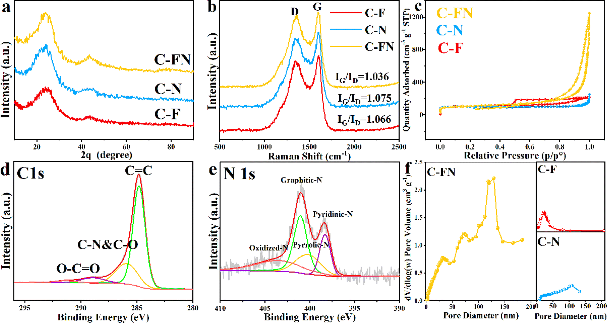 The XRD pattern of C–F, C–N, and C–FN is shown in Fig. 2a. There are two broad diffraction peaks at 25.2° and 43.4°, which are attributed to the (002) and (100) planes in the carbon structure.12 The peak intensity reflects some degree of graphitization in the samples. Fig. 2b displays the Raman spectrum of the three samples. The two peaks at 1343.2 and 1589.1 cm−1 belong to the D and G bands of the carbon. The IG/ID of the C–FN, C–N, and C–F are 1.036, 1.075, and 1.066, respectively, which reflect a relatively high degree of graphitization in the three samples.13 Based on the XRD and Raman analysis, different pore-forming agents have little effect on the degree of graphitization of the material.14 The BET-specific surfaces and porous structure of the C–F, C–N, and C–FN are obtained from the nitrogen adsorption–desorption isotherms (Fig. 2c and f). The result of C–N indicates type II isotherms that are typical of macroporous structures; the pore size distribution of C–N is around 100 nm. The C–F presents type IV isotherms that are typical of mesoporous materials with a diameter of ∼25 nm. The isothermal adsorption–desorption curve of C–FN reveals the composition of type II and IV.15,16 It is worth mentioning that the surface of C–FN, C–F, and C–N are 893.3, 405.6, and 403.2 m2 g−1. The C–FN not only possesses the highest BET surface but also has a large porous volume of 0.53 cm3 g−1 which is higher than that of C–N (0.27 cm3 g−1) and C–F (0.22 cm3 g−1). The high surface area and porous volume are beneficial to enhancing ion diffusion, as well as providing more reaction sites and space to store the discharge product. The surface bonding configurations of C and N of C–FN are revealed by XPS as shown in Fig. 2d and e. The C 1s peaks of C–FN contain three peaks that are centered at 284.8, 285.5, and 286.6 eV, due to the C