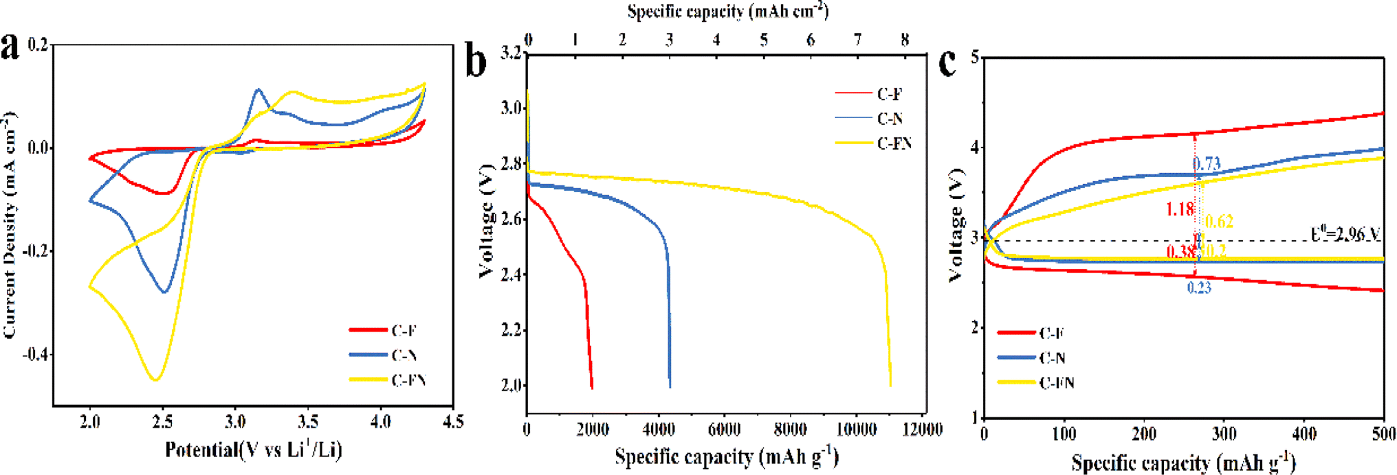 | Fig. 3 (a) CV curves; (b) the initial discharge profiles; (c) discharge–charge profiles at a cut-off capacity of 500 mA h g−1 of the battery with C–FN, C–F, and C–N cathode. | ||