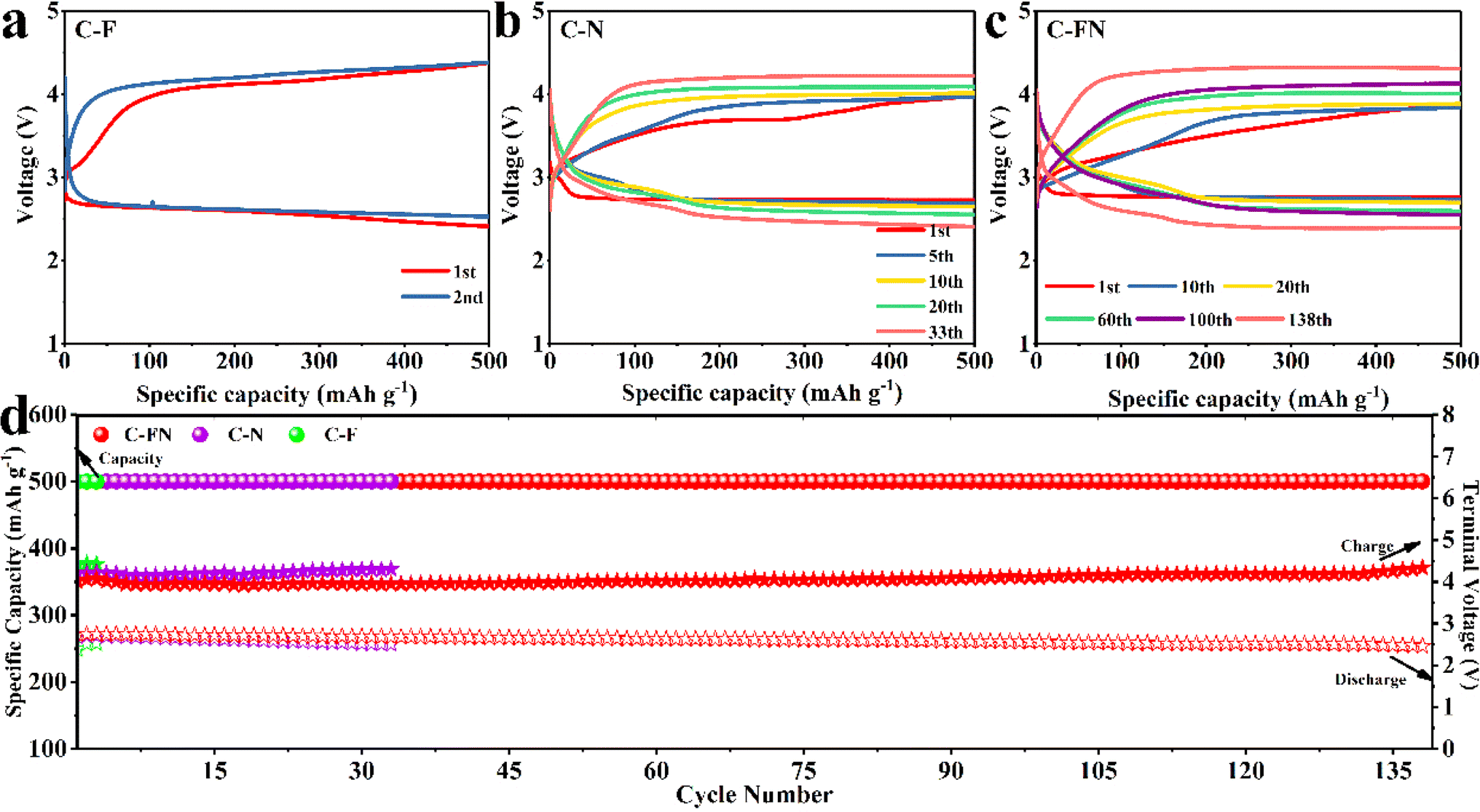 The cycling stability profiles of the C–FN, C–F, and C–N batteries were studied at a current density of 100 mA g−1 and a cut-off capacity of 500 mA h g−1. The selected charge–discharge (CD) profiles are shown in Fig. 4a–c. Before the first 20 cycles, the charge plateau of the C–FN cathode is stabilized at ∼3.5 V (Fig. 4c), and the discharge plateau is higher than 2.8 V. Up to the 100th cycle, the discharge voltage plateau is stabilized around 2.7 V, indicating good cycle stability. However, when cycling to the 138th cycle, the discharge platform quickly reduces to ∼2.5 V and the charging platform rises to 4.3 V. On the other hand, the CD profiles of C–N and C–F show a quick increase of the over-potential in the initial cycles. The charging platform of C–F is upper 4 V in the second cycle (Fig. 4a), and the charging platform of C–N is ∼4 V after the 20th cycle (Fig. 4b). As shown in Fig. 4d, the three cathodes are investigated at 100 mA g−1 at 2.0–4.3 V. The C–FN can maintain a stable circulation of 500 mA h g−1 for 138 cycles compared with the C–N and C–F for a few cycles.