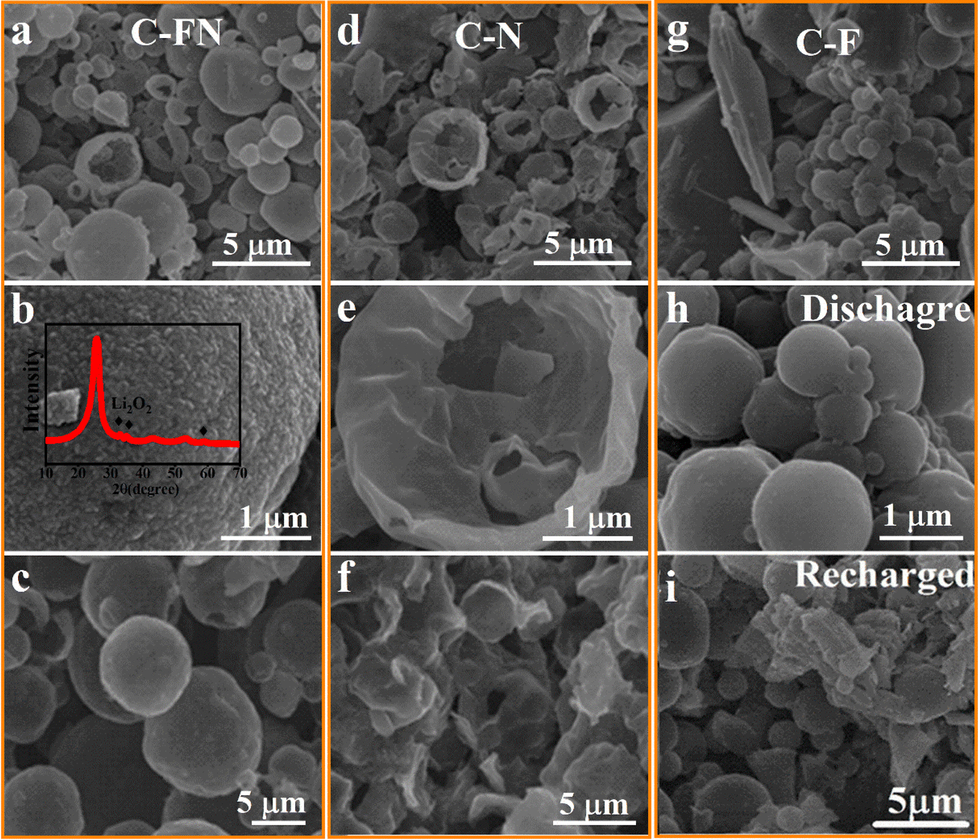 | Fig. 5 (a, b, d, e, g, and h) SEM images of C–F, C–N, and C–FN cathode that were discharged to 2.0 V; (c, f and then i) charged to 4.3 V. | ||