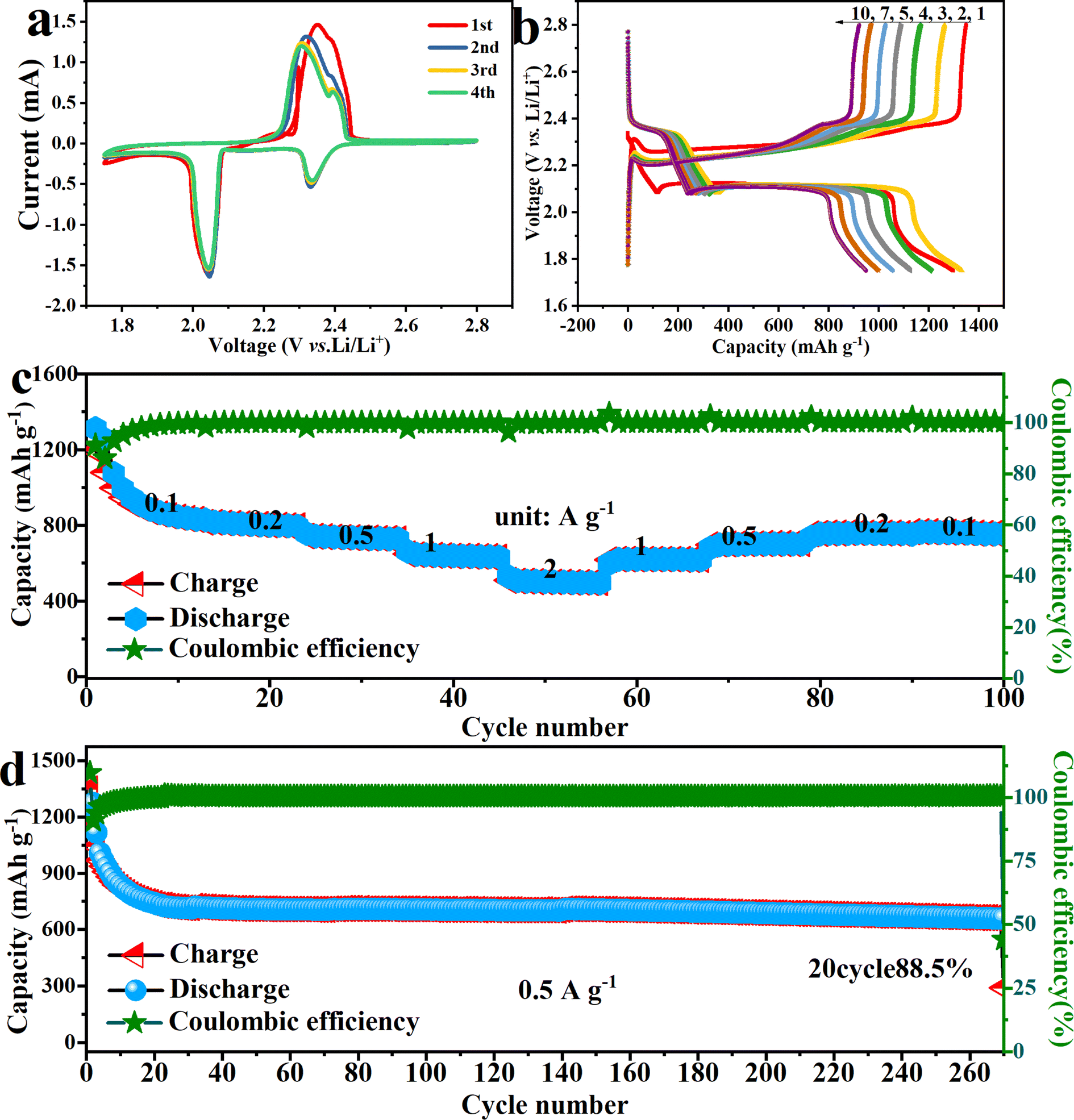 To further leverage its advantage and expand its usefulness, the C–FN is used as carbon substrates to load S and Se. The Li–S and Li–Se batteries are assembled with C–FN@S and C–FN@Se as cathodes, respectively. As observable in Fig. S8,† the lithium-ion coefficient of the C–FN-based cathode for Li–S and Li–Se battery is 2.35 × 10−11 and 1.58 × 10−11 m2 s−1 respectively. In addition, as shown in Fig. S9,† the lithium-ion coefficient of the C–FN cathode for Li–S ranges from 10−11 to 10−13 m2 s−1 which is in line with the result calculated with EIS, i.e., 2.35 × 10−11 m2 s−1. The DLi+ for Li–Se battery ranges from 10−10 to 10−12 m2 s−1 which is consistent with the finding from EIS, i.e., 1.5 × 10−11 m2 s−1. These results indicate the high ion diffusion rate in the C–FN-based cathode that proves to be a favorable factor for the high performance of the Li–S and Li–Se batteries. Fig. 6 shows the performance profile of Li–S batteries based on the C–FN@S cathodes. The CV curves (Fig. 6a) show that at a scan rate of 0.1 mV s−1, the actual position of the open circuit voltage is 2.3 V, and there are two obvious redox peaks on the first cycle curve. After the first cycle, the curves present four typical peaks: two anodic peaks (2.05 and 2.33 V) and two cathodic peaks (2.31 and 2.40 V), suggesting relatively low polarization and fast reaction kinetics. The two anodic peaks correspond to the conversion of high-valence lithium–sulfur compounds (such as Li2S8) to Li2Sn (8 > n ≥ 4) and then to Li2S2 or Li2S. The cathodic peaks correspond to Li2S, which gradually oxidized to Li2S8.27,28Fig. 6b illustrates the first 10 discharge–charge cycle curves, where the discharge capacity is as high as 1336.8 mA h g−1 for the first cycle. After a few cycles, the capacity gradually decreases until the tenth lap (962 mA h g−1). However, the polarization voltage decreases from 0.160 V for the first cycle to 0.101 V after cycling. This may be caused by the side reactions between sulfur and electrolyte to form a CEI (cathode–electrolyte interface).29,30 As shown in Fig. 6c, the specific capabilities of C–FN@S cathode are 920, 810, 738, 642, 504 mA h g−1 at different current densities of 0.1, 0.2, 0.5, 1.0, and 2.0 A g−1, indicating its high rate-specific capabilities. Fig. 6d revealed the long cycling stabilities of C–FN@S at 0.5 A g−1. After 270 cycles, it maintained a high capacity of 663.6 mA h g−1.