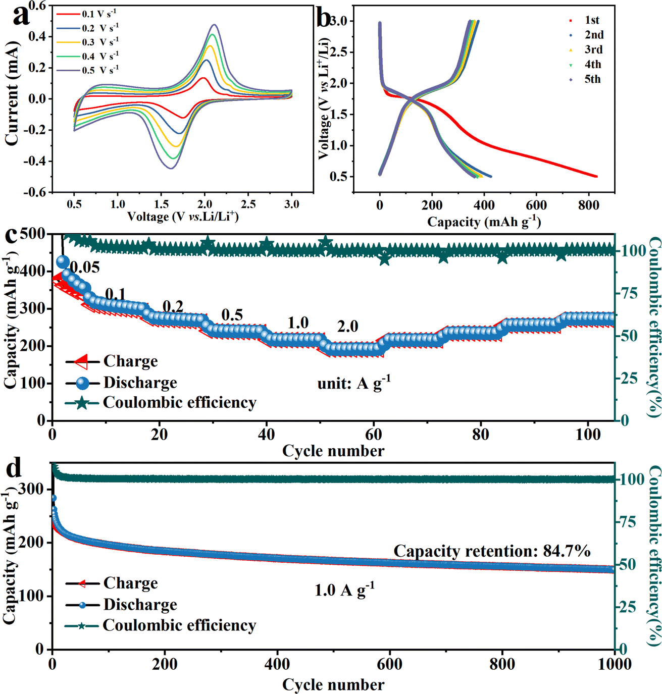 Selenium, as a member of the oxygen-sulfur group, is also loaded onto carbon spheres to prepare Li–Se batteries. The charge–discharge reaction mechanism is similar to that of the Li–S batteries. Selenium loading on C–FN is reduced to Li2Sen (n ≥ 4), Li2Se2, and finally to Li2Se during discharging. When charging, Li2Se is directly oxidized to Li2Sen (n ≥ 4) and then Se.31,32 As shown in Fig. 7a, the C–FN@Se cathodes were tested in the voltage range of 0.5–3.0 V at different scan rates of 0.1–0.5 mV s−1. A pair of oxidation/reduction peaks were observed at 1.75 and 2.01 V at a scan rate of 0.1 mV s−1. The shape was well maintained with an increasing scan rate, indicating good reversibility of charging and discharging. Fig. 7b shows charge/discharge cycling curves at 50 mA g−1 across a voltage window of 0.5–3.0 V. For the first cycle, the discharge capacitance is 840 mA h g−1. There are discharge and charge platforms at 1.7 and 1.9 V, respectively, which is in accordance with the redox peaks in the CV curves. The rate capability is presented in Fig. 7c, where the specific capacities are 288.4, 264.4, 257.7, 238.8, 212.4, and 163.4 mA h g−1 at 0.05, 0.1, 0.2, 0.5, 1.0, and 2.0 A g−1, respectively. The high rate performance could be ascribed to the stabilization and continuous structure of the C–FN cathodes throughout. As seen in Fig. 7d, the cycling performance of C–FN@Se cathodes is recorded up to 1000 cycles at a current density of 1.0 A g−1. In the initial cycles, the discharge capacity of the battery rapidly drops from 262.5 to 222.0 mA h g−1, which is due to a severe mismatch in the initial charging and discharging of the battery. We believe that this may be caused by the formation of the SEI (solid–electrolyte interface) film.33 Subsequently, the battery stabilizes gradually, and after 1000 cycles, the capacity retention rate remains around 80%. These observations confirm that the materials tested here possess excellent electrochemical stabilities.