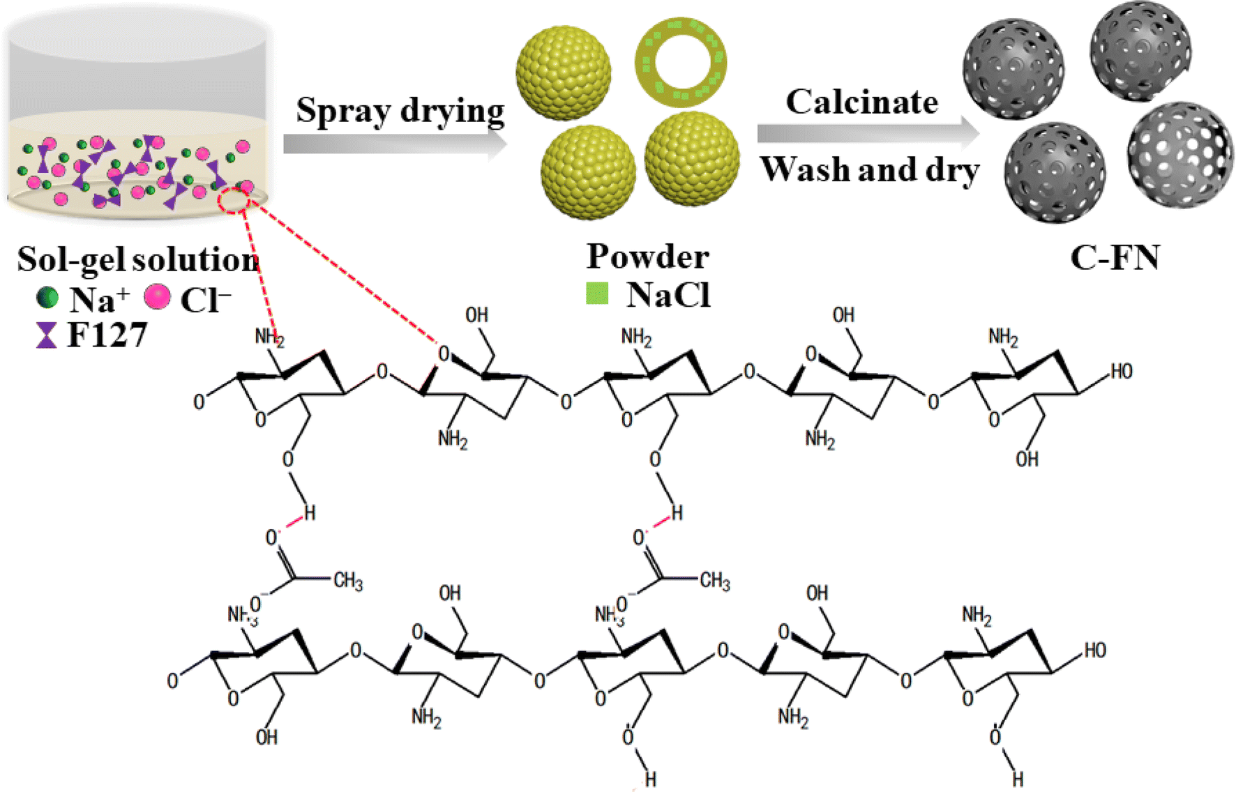 Ideal new-generation porous carbon materials should have the following characteristics, low-cost material resources, simple, and environmentally friendly preparation, and superb performance.9 However, most carbon materials are synthesized by using petroleum-based chemical products that are unsustainable and may cause environmental pollution. Chitosan can be facilely fabricated from chitin, which is the second most abundant natural bio-polymer collected from the shells of shrimps, insects, fungi, algae, and so on. Furthermore, when combined with intrinsic nitrogen elements, chitosan can form N-self-doped carbon after carbonization without any complex doping modification steps. Based on the above advantages, chitosan-derived porous carbon has been extensively investigated as biosensors, water treatment, and battery electrode materials. Conventional pore-forming techniques, such as the active method (KOH, ZnCl, H3PO4), consume high amounts of energy and use the hard-templating method (nano-silicon spheres, polystyrene spheres). It is also difficult to ensure the uniform dispersion of the template in the carbon precursor. This makes it difficult to control the preparation of mesoporous carbon, especially on a large scale.10 It is of immense importance to achieve the mass production of advanced porous carbon materials with sustainable carbon sources.