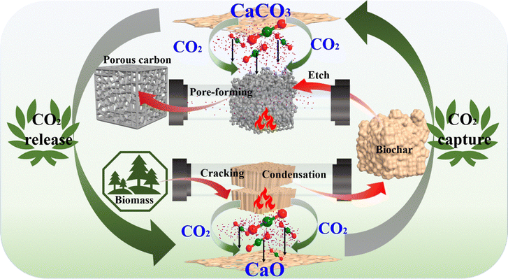 CaO meets these criteria as it can absorb CO2 formed from pyrolysis to form CaCO3, which further decomposes to form CaO and CO2 at higher temperature.10,11 The released CO2 further etches carbonaceous materials, creating micropores.12,13 This process converts CaCO3 again into CaO, as demonstrated in Scheme 1.