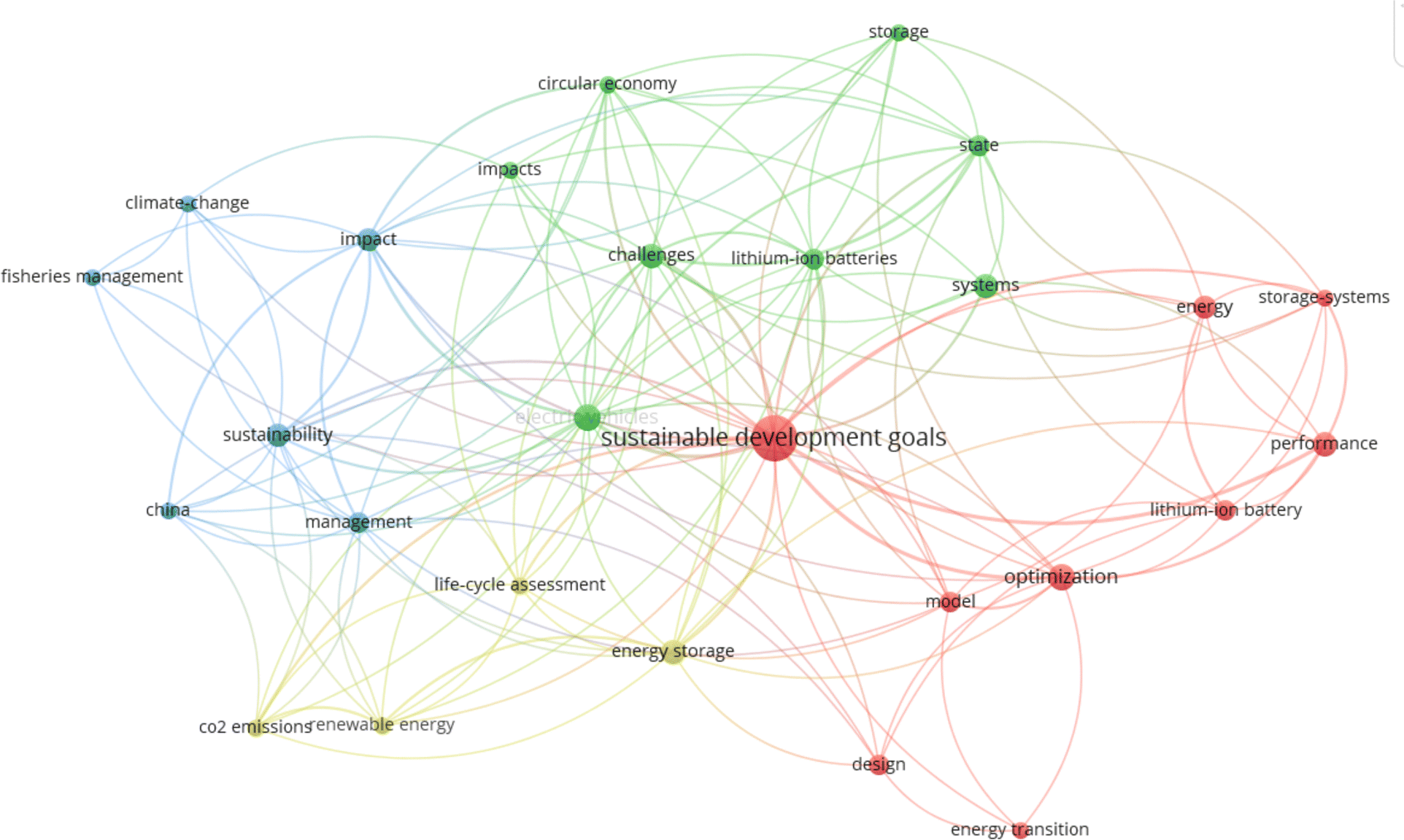 To determine the general trends in the scientific community and to see the relationship between batteries and SDGs, a bibliometric analysis was conducted under the WOS Database with the words in all fields: “battery” and “sustainable development goals/sdg” for the years between 2014 and 2024, resulting in 203 articles. Fig. 11 shows the keyword co-occurrence analysis, where the “sustainable development goals” is in the center, surrounded by various keywords such as “lithium-ion batteries”, “energy storage”, “life cycle assessment”, “circular economy”, etc.