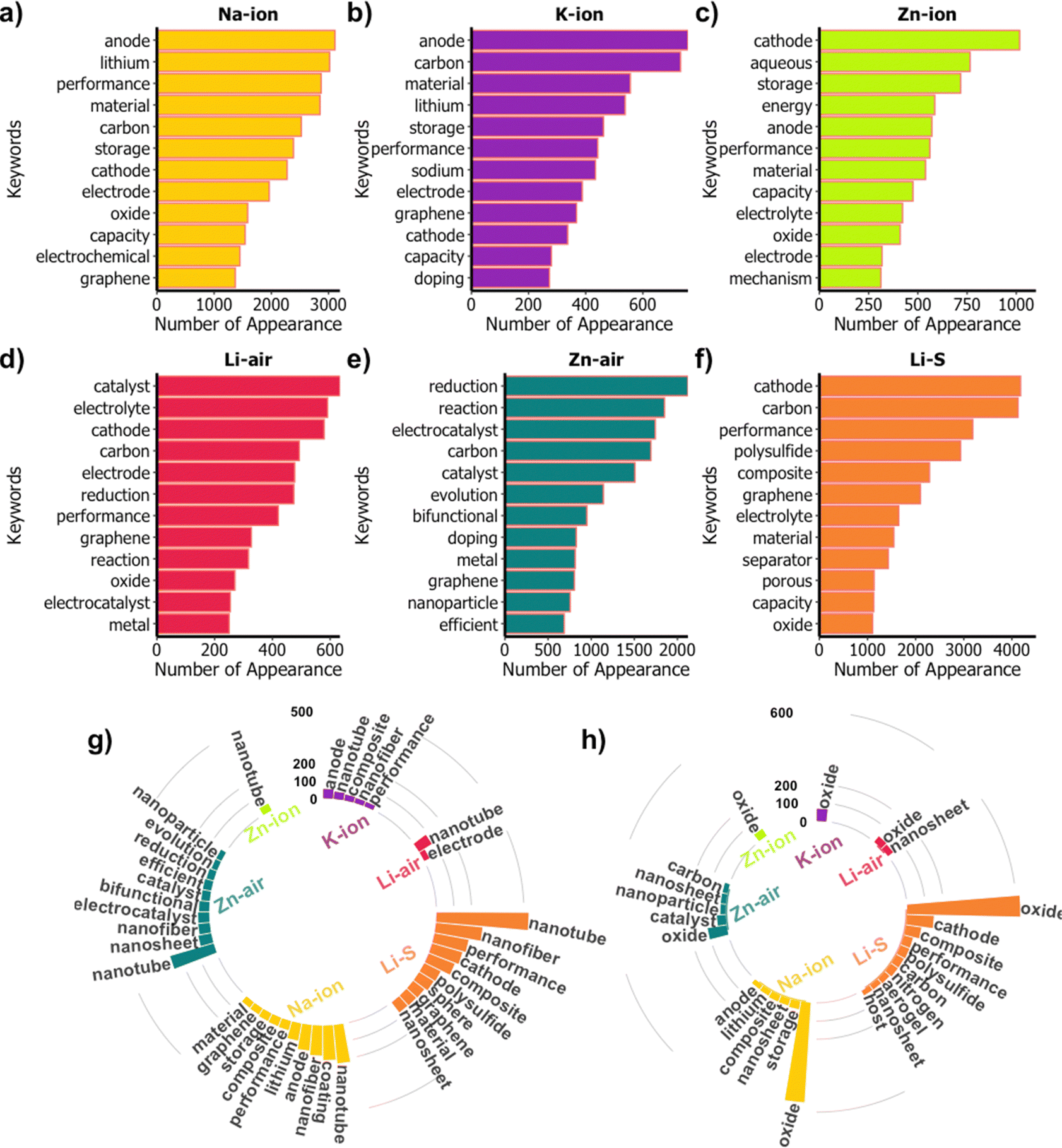 Members of metal-ion batteries, both mono- and multivalent batteries, work similarly as all of them have the rocking chair mechanisms where a single ion transfers between the two electrodes.216 The most popular univalent chemistries are sodium- and potassium-ion batteries, and the biggest advantages of these metals are their low cost and natural abundance. However, due to the change in the ion size of Na+ (∼1.02 Å) and K+ (∼1.38 Å) compared to Li+ (∼0.76 Å), special materials should be designed specifically with large internal spaces for these new chemistries.216 In addition, multivalent metals, due to the multi-ion transfer, have much higher theoretical capacities. Zn-ion batteries are among the most popular battery chemistries, but they also face Zn metal stability problems and limited available positive electrode materials.217 In this respect, as seen from the keyword analysis of the beyond Li-ion literature, given in Fig. 13, electrode designs are the top priority for metal-ion batteries. On the other hand, conversion chemistries, such as Li–S, Zn– and Li–air batteries, have attracted attention recently due to their high specific energy. The polysulfide shuttle mechanism, the insulating nature of sulfur, and volume expansions during cycling are the main obstacles of metal-sulfur batteries. The metal-air battery problems are also associated with positive electrodes, where oxygen redox reactions are problematic.218 Hence, the cathode and electrolyte design are found to be at the heart of research areas.