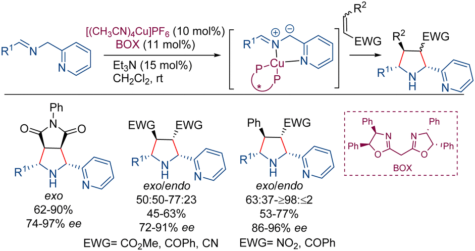 The first example of this kind of process was reported by Grigg and co-workers7 in 1991, using stoichiometric amounts of a cobalt salt and a chiral ligand derived from ephedrine, and the reaction proceeded with high yield and enantioselectivity. Inspired by this work, the first catalytic examples of this cycloaddition were reported by the groups of Zhang8 and Jorgensen9 in 2002, employing Zn- and Ag-based catalytic systems, respectively.