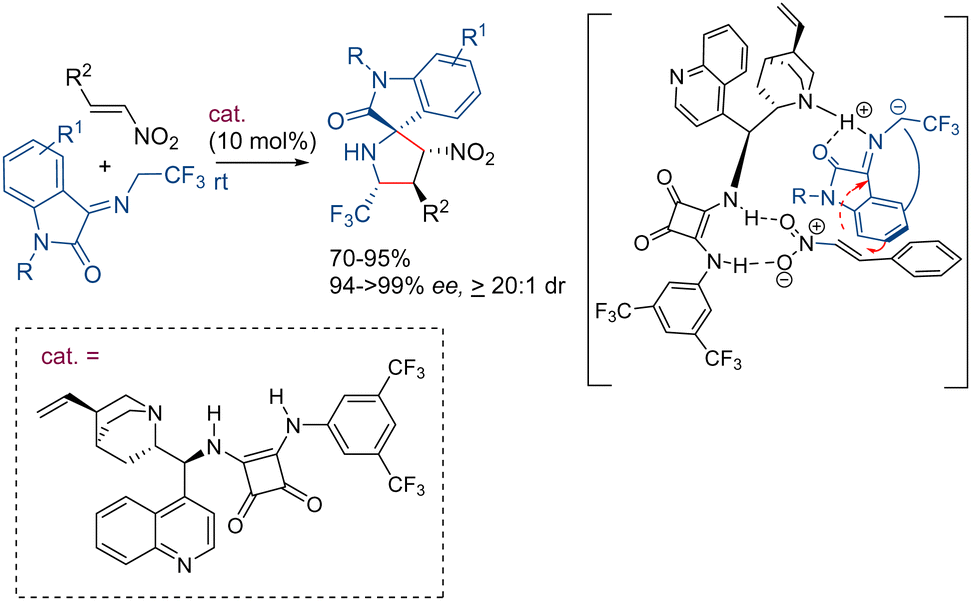 In 2015, the same research group reported the catalytic asymmetric cycloaddition of trifluoromethyl-containing azomethine ylides with β-nitroalkenes.46 Various spiro[pyrrolidin-3,2′-oxindoles] were synthesized with excellent yields and high diastereo- and enantioselectivities using a cinchona alkaloid-derived squaramide-catalyst. The bifunctional catalyst activated both substrates, the squaramide moiety coordinates via the nitro styrene while the tertiary nitrogen of the chinchona coordinates via the azomethine ylide, then the cycloaddition by the Re-face would take place (Scheme 20).