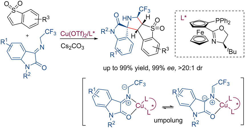 In 2022, Yuan, Zhao, Zhang and co-workers64 described the use of benzo[b]thiophene sulfones as dipolarophiles. Using a Cu(OTf)2/Phosferrox complex as a ligand, and Cs2CO3 as a base, different substituted pentacyclic spirooxindoles were obtained with excellent diastereo- and enantioselectivites. The umpolung of N-2,2,2-trifluoroethylisatin ketimines led to an unexpected regioisomer of the spirooxindole compounds (Scheme 23).