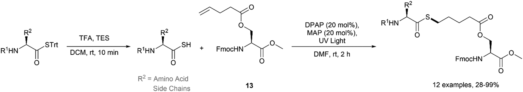 Recently, our group reported the application of the acyl thiol–ene reaction for the synthesis of thioester derivatives of biomolecules.17 In this study, thioacids were prepared by deprotection of the corresponding S-trityl thioester upon treatment with trifluoroacetic acid (TFA) prior to use. A diverse range of amino acid derived thioacids were reacted with serine-derived alkene 13 under UV irradiation (354 nm) using 20 mol% 2,2-dimethoxy-2-phenylacetophenone (DPAP) as the photoinitiator and 20 mol% 4-methoxyacetophenone (MAP) as a photosensitiser in DMF (Fig. 15). It was necessary to use at least 3 equivalents of the thioacid to force quantitative conversion to the thioester during optimisation due to the competing dethiocarboxylation of the thioacid radical depleting the active species. The reaction was found to be compatible with Fmoc, Boc and tBu protecting groups which are frequently used in peptide chemistry.