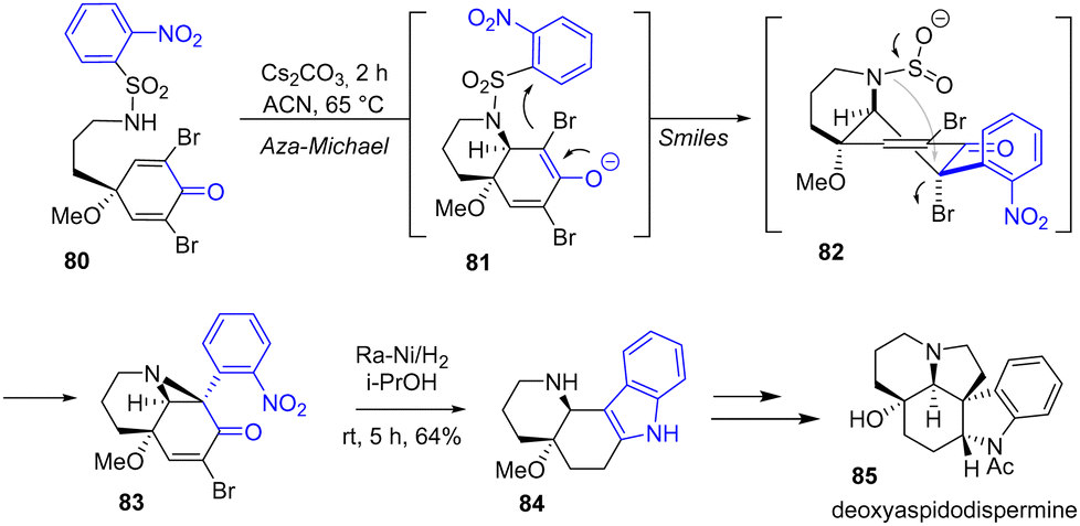 In 2022, Canesi and coworkers reported a total synthesis of deoxyaspidodispermine 85 using an ortho-nosyl functional protecting group to introduce the indole moiety into the natural product (Scheme 20).38 This synthesis highlights an aza-Michael-Smiles ring-closure cascade, which enables the formation of a tetracyclic system from a nosylamide functional protecting group. In the fourth step of the synthesis of deoxyaspidodispermine 85, an indole formation step was required to form the tetracyclic system. This was achieved by reduction of the nitro group, the bromide, and the double bond of bicyclic enone 83 using RANEY® nickel and cyclization to indole intermediate 84 with a yield of 64%. This key compound was then transformed into the natural product 85.