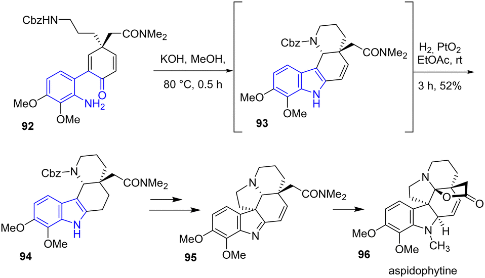 The same year, Banwell, Ye, and coworkers developed formal asymmetric syntheses of aspidophytine 96, a pentacyclic indole alkaloid (Scheme 22).41 To generate the indole ring and piperidine rings of aspidophytine, the authors performed a Schiff base condensation-hetero-Michael-type cascade of 92 to generate an unstable indole intermediate 93. After hydrogenating using Adam's catalyst, they isolated indole 94 in a yield of 52%, which was subsequently used in later steps for the formation of 95.