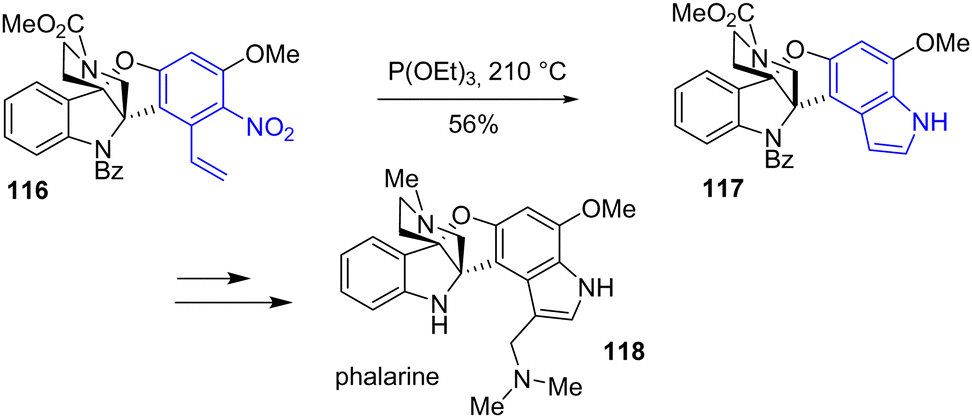 The same year, Jia and coworkers completed an eight-step total synthesis of phalarine 118, a furanobisindole alkaloid that contains a unique structure, a benzofuro[3,2-b]indoline framework (Scheme 28).47 This synthesis was the first regioselective oxidative coupling of a 2,3-disubstituted indole with a phenol using a hypervalent iodine reagent (PIDA) to generate the benzofuro[3,2-b]indoline framework. Later into the synthesis, the authors introduced the indole moiety into the natural product by a Cadogan reductive cyclization with nitroarene 116 using triethyl phosphite to form indole 117 with a yield of 56%. Two steps later, phalarine 118 was obtained.