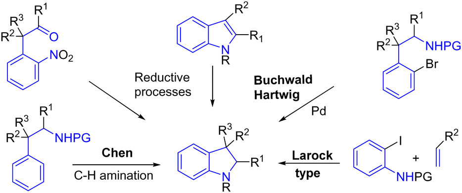 Indole alkaloids have aroused the curiosity of chemists, and the preparation of their main heterocycle has often been reported as the key synthetic step in their total synthesis. Consequently, the development of new methodologies for the rapid formation of such heterocycles has been considered a critical goal by chemists involved in total synthesis. These strategies have laid the foundation for rapid access to these important scaffolds. In this review, we report on the most recent approaches over the past eleven years from 2014 that have been used by chemists to achieve the synthesis of the main indole or indoline core present in the total synthesis of complex natural products. The heterocycle formation of more than 40 syntheses is described as a key step in the development of these complex natural products. However, this review does not report on the biosynthetically inspired total syntheses starting from an indole or indoline precursor as starting materials, and some elegant syntheses of these complex alkaloids are not reported and would constitute another review topic that would include, for example, the work of Vincent, Zhu, and many other remarkable total syntheses carried out by leading groups in this field, which unfortunately cannot all be cited in this review.7