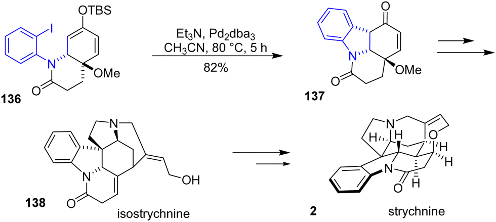 | Scheme 35 Pd-catalyzed Heck cyclization of the indoline skeleton in the synthesis of isoctrychnine 138. | ||