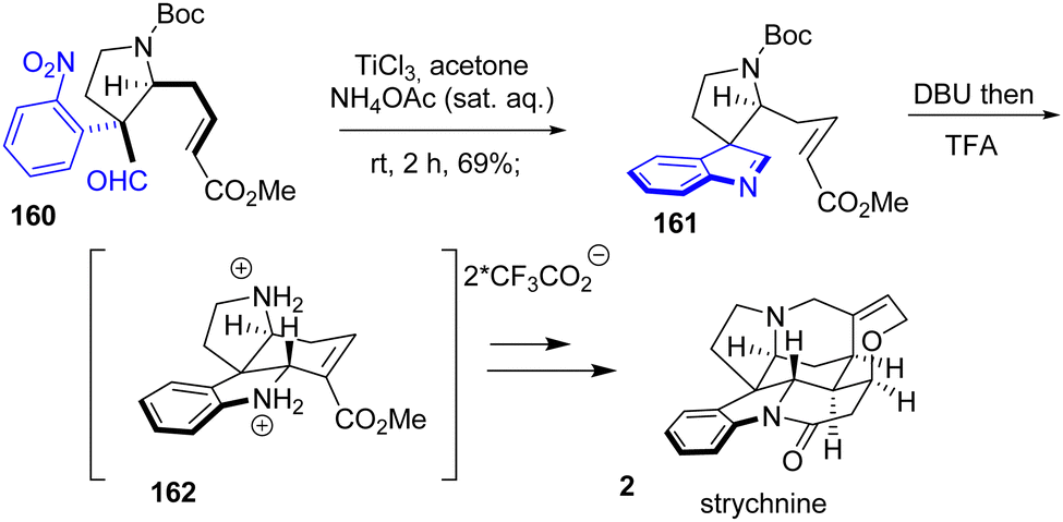 In 2017, Chen and coworkers reported the total synthesis of strychnine 2, a strychnos indole alkaloid (Scheme 41).63 Their strategy involves the reduction of a nitroarene followed by the condensation of an aldehyde to generate an indolenine, an intermediate in the introduction of the indoline moiety. However, the in situ reaction of aniline and aldehyde alone was not able to produce indolenine 161. This was only achieved by treating nitroarene 160 with TiCl3 in a 1