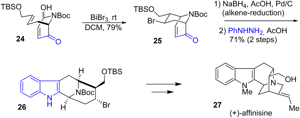 In 2023, Tong and coworkers developed a concise synthesis of several suaveoline and other sarpagine alkaloids (Scheme 6).21 These natural products have attracted synthetic interest due to their unusual indole-fused 9-azabicyclo[3.3.1]nonane structure (9-ABN). Their strategy involves a Lewis acid-mediated intramolecular aza-Prins cyclization mediated by BiBr3 to generate the bicyclic piperidine rings. After this step, the alkene of the bicyclic enone 25 was reduced, and a Fischer indolization in two steps generated the 9-ABN system 26 with a yield of 71%. Several steps later, this allowed the synthesis of several natural products such as (+)-affinisine 27.