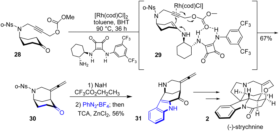 The same year, Zhang and colleagues reported a total synthesis of several strychnan alkaloids22 using a fascinating bridge backbone strategy (Scheme 7). Their work involves an asymmetric α-allenylation of ketones using a cyclohexanone 28 as the precursor in the presence of a metal catalyst and an amine-containing organocatalyst. This allows for the simultaneous formation of a piperidine ring and an allene to bicyclic 30. After having access to this precursor, the authors were interested in applying their methodology to total synthesis. The next step involves installing the indoline moiety through a Japp–Klingemann reaction and Fischer indole-type process. Treatment of precursor 30 with NaH and CF3CO2CH2CF3 followed by PhN2BF4 in the presence of trichloroacetic acid (TCA) and ZnCl2 produced indole 31 in 56% yields. This was then carried out on various strychnan alkaloids, such as (−)-strychnine 2.
