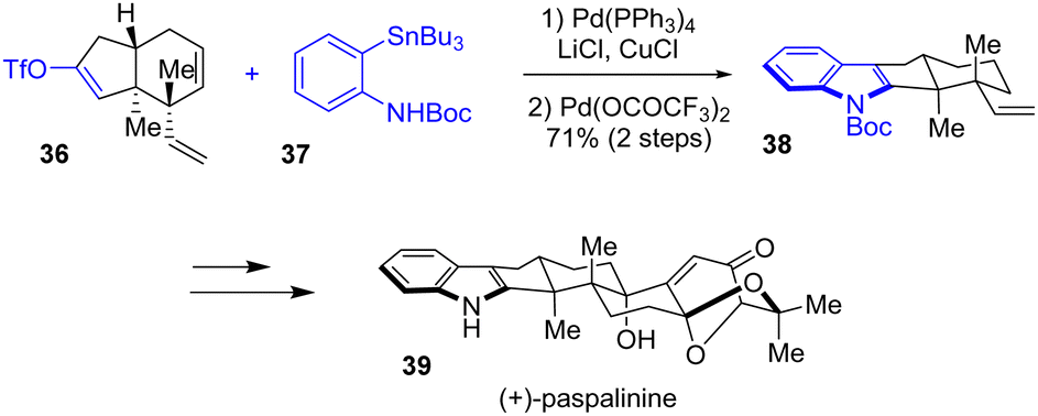 In the meantime, Tong and coworkers published an asymmetric total synthesis of indole diterpenes, paspalinine 39 and paspalinine-13-ene, with a similar strategy (Scheme 9).24 These structures contain a complex, 6,8-dioxabicyclo[3.2.1]octane motif. To synthesize the indole portion of these natural products, the authors utilized a Stille-coupling reaction between triflyl enol ether 36 and ortho-N-Boc protected aniline 37 as well as a PdII-mediated aza-Wacker reaction. This generated tetracyclic indole 38 in a yield of 71%, which served as the building block for e.g., paspalinine 39.