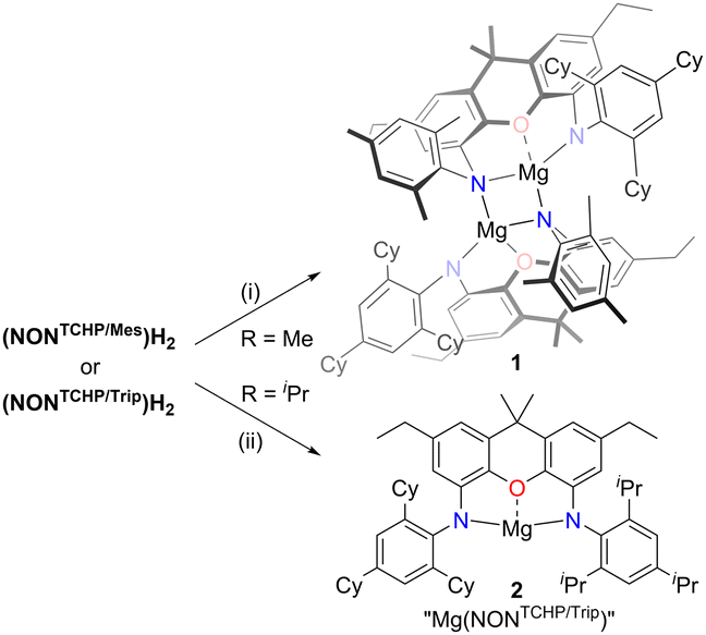 | Scheme 2 Synthesis of magnesium(II) complexes 1 and 2. (i) Mg(CH2SiMe3)2, C6H6, 80 °C. (ii) Mg(CH2SiMe3)2, methylcyclohexane, 80 °C. | ||