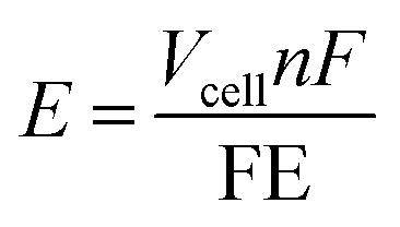 where E (MWh per ton HNO3) is the energy intensity, Vcell (V) is the cell voltage, n is the number of electrons required to convert N2 to 1 mole of NO3 using the conservative assumption that the reaction is purely electrochemical, and F (C mol−1) is the Faraday's constant. If part of the process proceeds through chemical steps rather than electrochemical charge transfer, the effective electron requirement would be lower, and the corresponding energy intensity would decrease, making these results even more favorable. While this is a clear simplification of a very nuanced and complex process, it nonetheless illustrates the strong leverage of FE and cell voltage on the energy demand as highlighted in Fig. 9. To approach the energy intensity of the conventional Ostwald process for nitrate production,2 the NOR technology must aim for cell voltages below 1.9 V and a FE of above 65%. We present this estimation not as a definitive benchmark but as an invitation for continued discussion and refinement of performance targets needed for electrochemical NOR to become competitive with the industrial nitric acid synthesis.