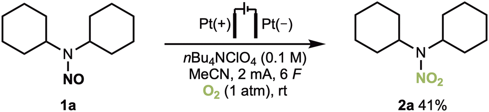 In a preliminary investigation, the oxidation of N-nitrosodicyclohexylamine 1a to N-nitrodicyclohexylamine 2a was investigated under 1 atmosphere of oxygen pressure under galvanostatic conditions with a commercially available undivided batch electrochemical reactor, where the desired product 2a was obtained in 41% yield (Scheme 2).