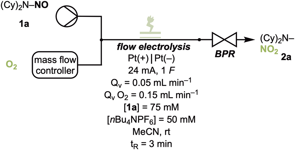 To conclude, a mild biphasic continuous-flow electrochemical method towards the synthesis of a wide assortment of aliphatic N-nitramines from N-nitrosamines via a convergent paired electrolysis has been developed. Electrochemically generated superoxide radical anions from molecular oxygen have been used as a safe and clean oxidant under ambient temperatures, avoiding the requirement of any harsh and toxic oxidising agents.