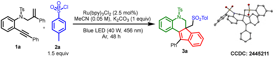 We started the screening with a 2-(phenylethynyl)-N-(2-phenylallyl)-aniline derivative, 1a, as a model substrate and tosyl chloride (TsCl) as the sulfonyl source. Using Ru(bpy)3Cl2 as the photocatalyst with K2CO3 as the base in acetonitrile as solvent under blue LED irradiation (wavelength of 456 nm, 40 W) for 48 h, we obtained an 83% yield of the desired tetracyclic indeno-quinoline derivative (entry 1, Table 1). Other solvents including methanol and EtOH did not furnish the desired product in good yields (entries 2–8, Table 1). Similarly, other bases and additives including Na3PO4, Na2HPO4, NaH2PO4, and NaHCO3 also gave lower yields of the desired product (entries 10 and 11, Table 1). When the reaction was carried out with organic bases such as triethylamine and pyridine, the yield of the desired product was reduced further. When the photocatalyst was changed to Eosin Y or Irppy3, we obtained 64% and 30% yields, respectively (entries 16 and 17, Table 1).