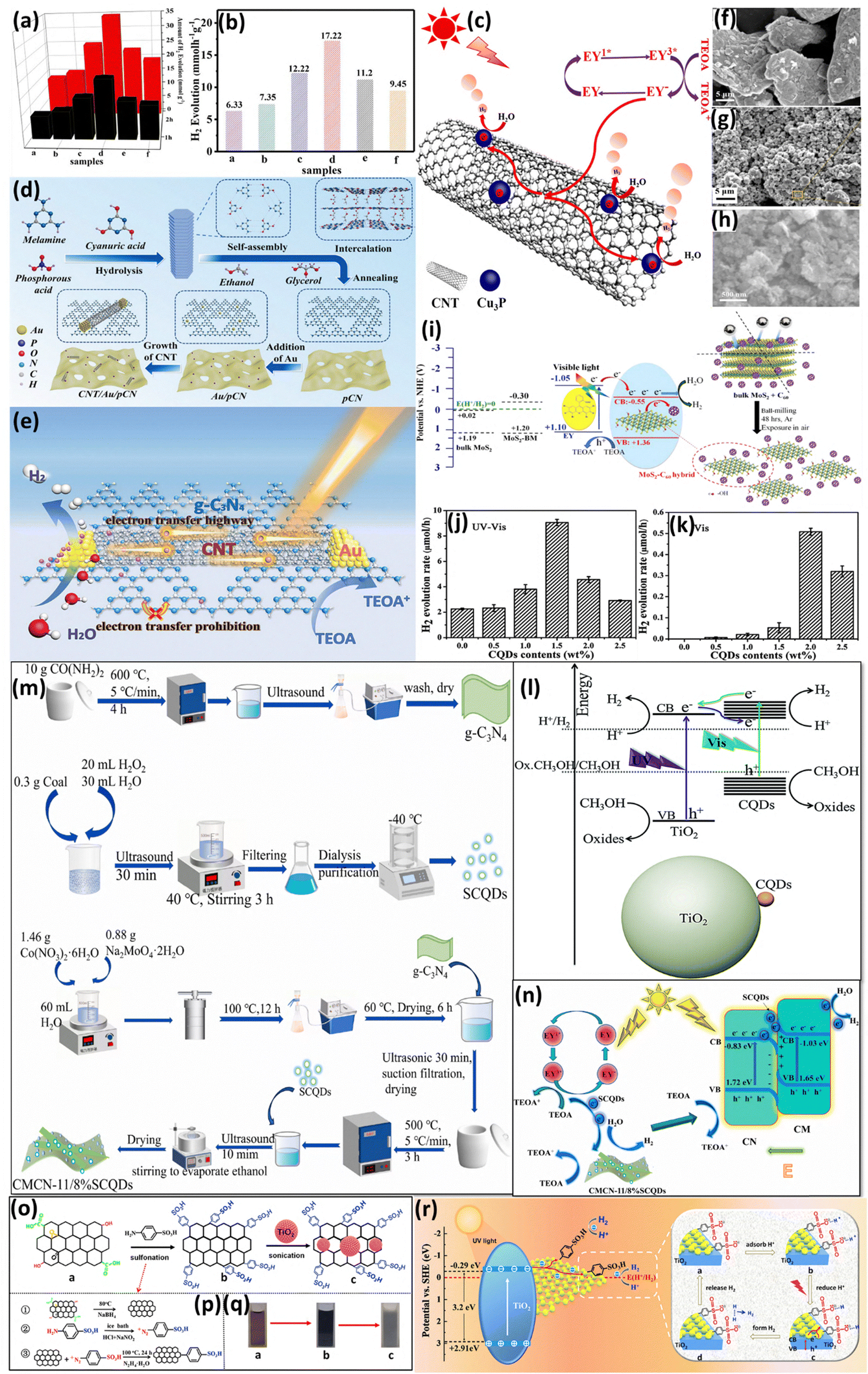 | Fig. 11 (a) H2 evolution study by time. (b) H2 evolution study of different systems ((a) Cu3P, (b) Cu3P-0.5% CNT, (c) Cu3P-1% CNT, (d) Cu3P-3% CNT, (e) Cu3P-5% CNT, (f) Cu3P-10% CNT). (c) Mechanism of H2 evolution via Cu3P-CNT. Reproduced with permission.105 Copyright 2018, American Chemical Society. (d) Synthesis scheme of CNT/Au/g-C3N4. (e) Mechanism of H2 evolution via CNT/Au/g-C3N4. Reproduced with permission.106 Copyright 2022, John Wiley and Sons. (f)–(h) SEM images of bulk MoS2 and ball milled MoS2-C60-BM3. (i) The left side shows the mechanism of H2 evolution via the MoS2-C60 hybrid and the right side shows the ball milling process. Reproduced with permission.107 Copyright 2018, Elsevier. (j) and (k) H2 generation rate study via UV-Vis and visible light of pure TiO2 and different wt% loaded CQDs. (l) Plausible mechanism of photocatalytic H2 evolution via CQDs/TiO2. Reproduced with permission.108 Copyright 2015, American Chemical Society. (m) Schematic representation of the synthesis scheme of CMCN-11/8%SCQDs. (n) Mechanism of photocatalytic H2 evolution of CMCN-11/8%SCQDs. Reproduced with permission.109 Copyright 2024, Elsevier. (o) Schematic representation of the synthesis scheme of rGO–SO3H/TiO2. (p) Formation scheme of rGO–SO3H. (q) Digital pictures of (a) rGO, (b) rGO–SO3H, and (c) rGO–SO3H/TiO2. (r) Mechanism of photocatalytic H2 evolution via rGO–SO3H/TiO2. Reproduced with permission.110 Copyright 2022, Elsevier. | ||