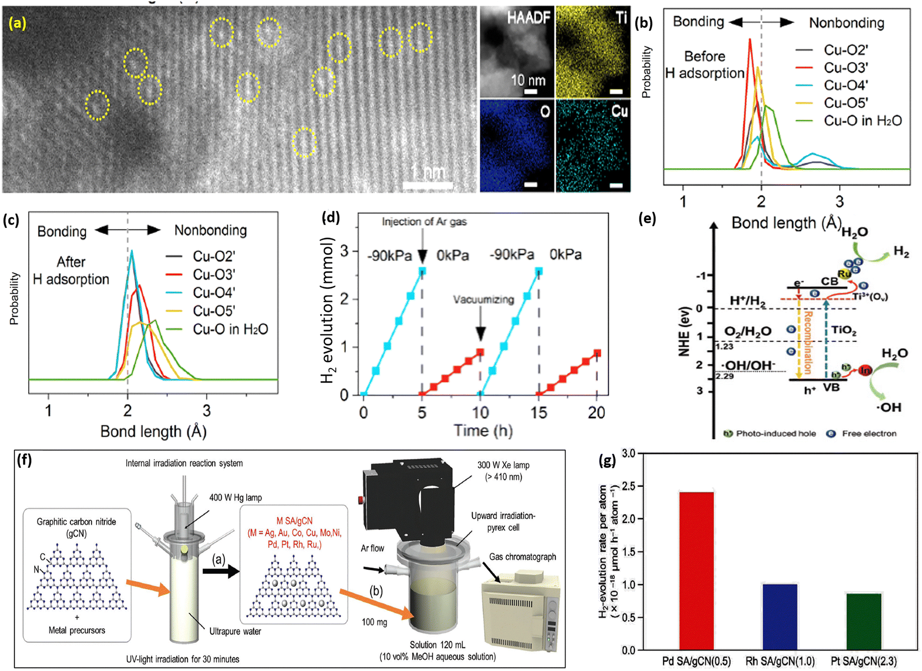 | Fig. 1 (a) High-resolution STEM and STEM-EDS mapping of Cu-SAC/TiO2. (b) and (c) Cu–O bond length distributions before and after hydrogen adsorption at 300 K. The observed elongation of Cu–O bond lengths after hydrogen adsorption indicates that the electron donated by the hydrogen atom enters Cu atom's d orbital, resulting in a repulsive interaction between the Cu atom and the H2O molecule. (d) Photocatalytic H2 evolution of Cu-SAC/TiO2 under varying dynamic pressure in an Ar-protected environment, with 0 kPa being the standard atmospheric pressure. Reproduced with permission.43 Copyright 2023, American Chemical Society. (e) The tentative mechanism for photocatalytic H2 production over Ru–In SA/TiO2. Reproduced with permission.44 Copyright 2022, Wiley. (f) (a) Synthesis of M SA-loaded g-CN and (b) photocatalytic H2 evolution for M SA/g-CN photocatalysts. (g) H2 evolution rate per metal atom for M SA/g-CN photocatalysts. Reproduced with permission.45 Copyright 2023, Wiley. | ||
