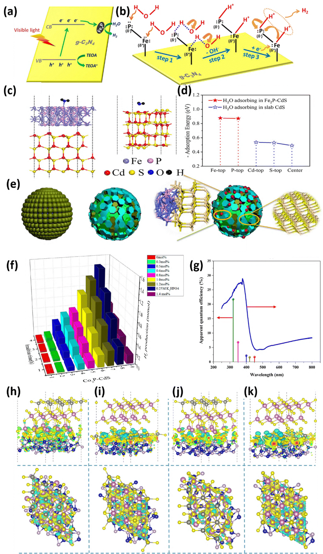 Liang et al.73 advanced the application of metal phosphides in the realm of photocatalysis by presenting a highly efficient 2D–1D Fe2P–CdS heterojunction photocatalyst. This innovative composite is designed to address the inherent challenges associated with CdS nanorods, notably rapid electron–hole recombination and insufficient stability. The Fe2P nanosheets, which are synthesized through a mild solvothermal method, exhibit an ultrathin structure (∼1.41 nm) characterized by an abundance of defect sites that facilitate exceptional catalytic activity. The integration of Fe2P nanosheets with CdS nanorods results in the formation of robust heterojunctions, which significantly augment charge transfer and separation efficiency. This composite has demonstrated a remarkable H2 evolution under visible light, surpassing the performance of bare CdS by a factor of 78.7. The superior catalytic performance of the Fe2P–CdS composite can be attributed to several synergistic mechanisms. Notably, a strong ionic interaction between Fe2P and CdS, as established by charge density difference calculations, promotes the migration of electrons from CdS to Fe2P, thereby mitigating recombination losses. Furthermore, as evidenced in Fig. 7c and d, the presence of Fe2P significantly enhances water adsorption, with calculated adsorption energy values ranging from −0.870 to −0.876 eV, which exceed those of pristine CdS (−0.490 to −0.536 eV). This enhanced water adsorption, in combination with a lower hydrogen reduction overpotential, serves to accelerate the hydrogen evolution. Employing experimental techniques such as time-resolved photoluminescence and electron spin resonance, it has been demonstrated that the 2D–1D heterostructure effectively suppresses charge recombination, resulting in the generation of abundant photo-reactive species. Additionally, the Fe2P–CdS hybrid exhibits notable stability over repeated cycles, underscoring its potential as a sustainable, noble-metal-free photocatalyst for H2 evolution.